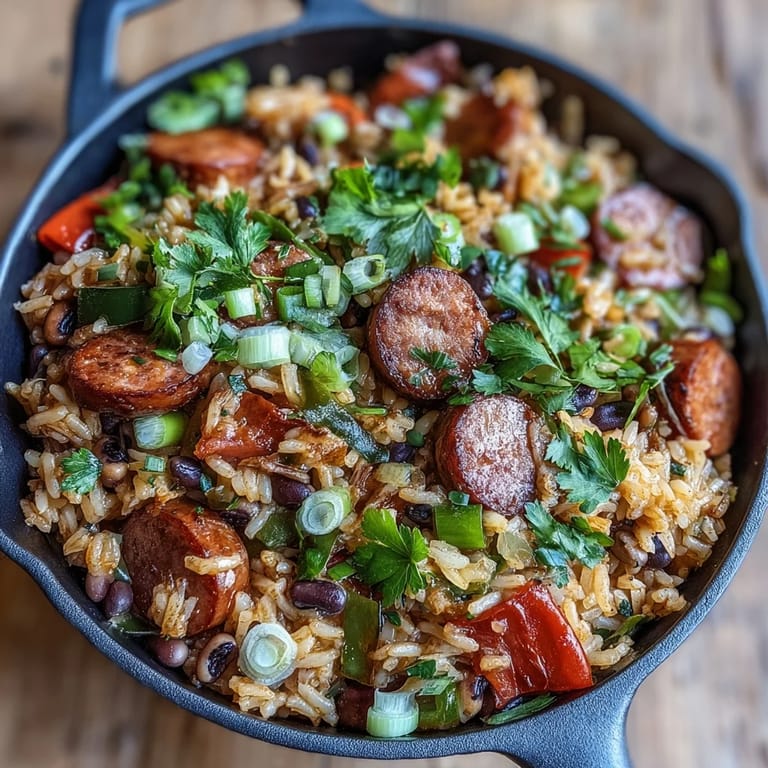 Pin It I had this dish during a moment when I really needed something uncomplicated and nourishing, and it delivered exactly that. There's something about spooning jambalaya into a bowl and seeing all the colors and textures mixed together—the burgundy of the sausage, the red and green peppers, the black-eyed peas dotted throughout—and knowing it's going to taste like comfort and spice at the same time. Food like this reminds you why cooking matters.