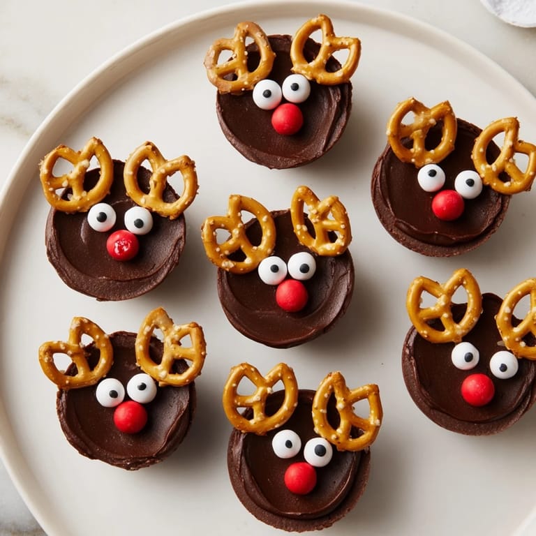Use candy eyes, red candy-coated chocolates for noses, and mini pretzels broken in half as antlers, attaching them with chocolate frosting for stability.