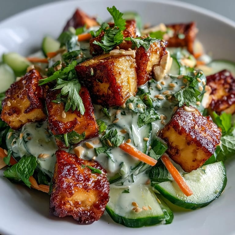 Pin It The first batch of tofu I ever crisped up stuck to the pan in a stubborn, crumbly mess. I hadn't pressed it long enough, and the moisture turned everything into mush instead of gold. Now, I know better. I press that block like I mean it, let the cucumbers weep their water into the sink, and whisk the dressing until it's silky and sharp. This salad is all about texture: cool crunch, creamy tang, and those little cubes of tofu that shatter when you bite down.