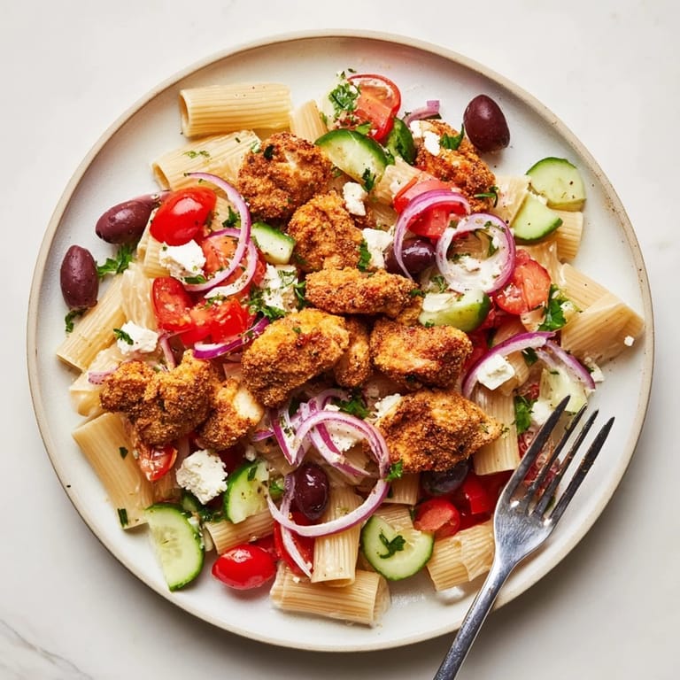 - Add the warm pasta to the salad bowl and toss until the dressing coats every piece. Top with the crispy chicken bites, sprinkle extra feta and parsley if you like, and serve immediately while the chicken is still hot.