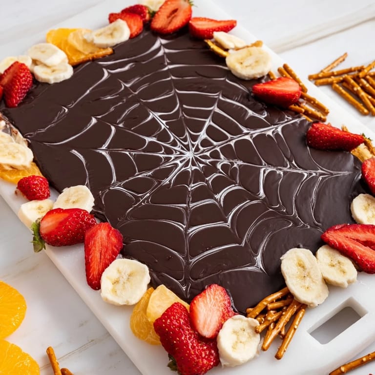 Pin It A show-stopping Halloween dessert featuring a rich chocolate ganache spread artfully decorated with a white chocolate spiderweb, served with an assortment of dippable treats.