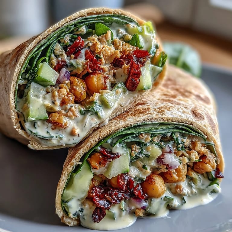 Pin It There's something magical about Mediterranean flavors that transport you to sun-drenched coastlines with every bite. These Vegan Lemon Tahini Chickpea Wraps capture that essence perfectly, combining protein-rich chickpeas with fresh vegetables and a creamy, zesty dressing that ties everything together. The contrast between the hearty chickpeas, crisp vegetables, and tangy dressing creates a satisfying meal that's as nourishing as it is delicious.